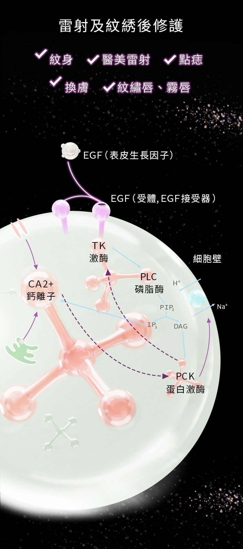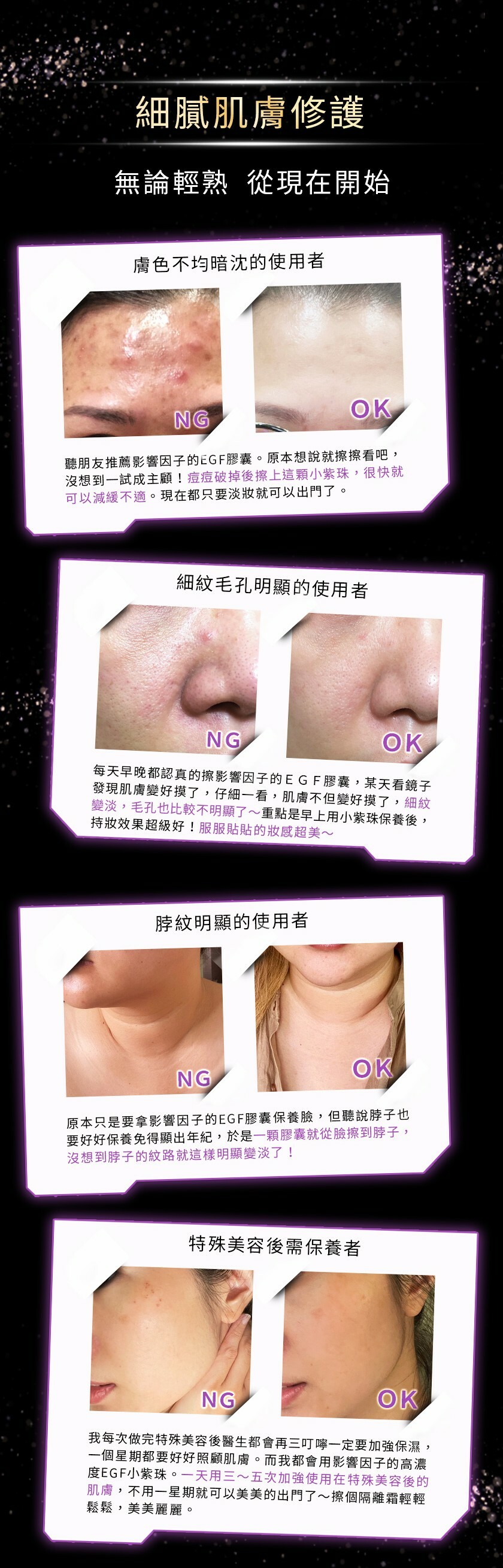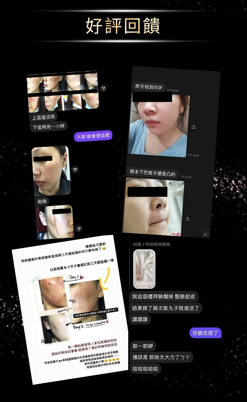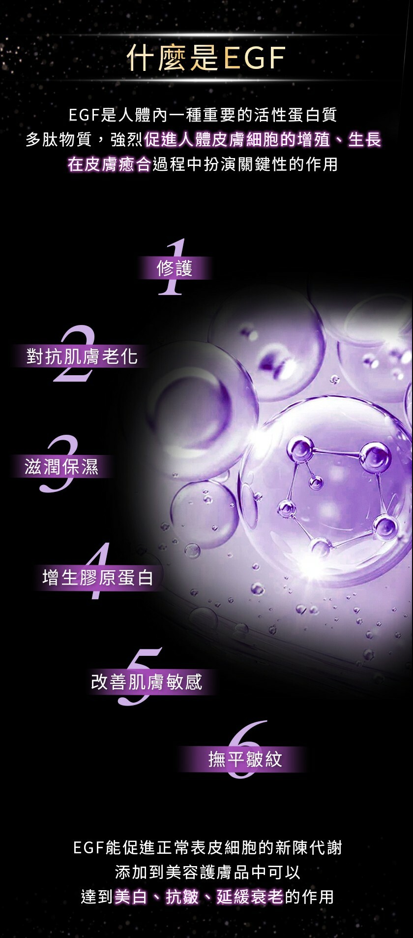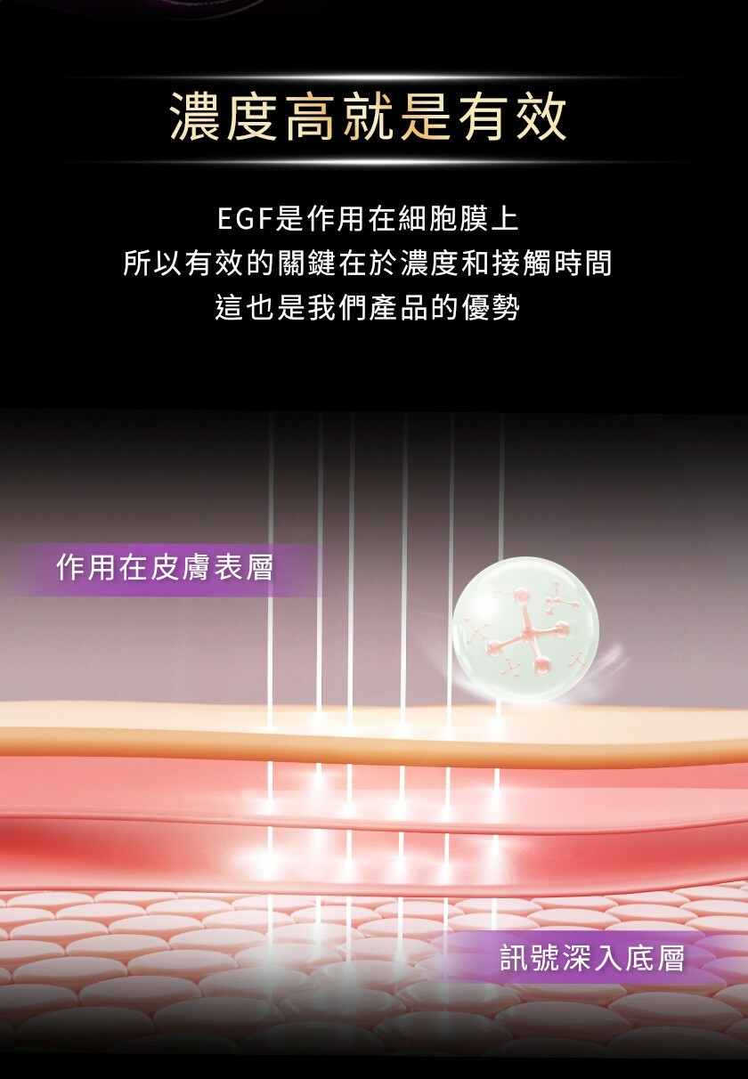- 高濃度EGF能協助肌膚撫平皺紋,減緩痘痘後期不適